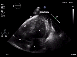 视频5-6 :心脏超声造影提示:右室流出道与左室心尖间外壁血肿形成。中大量心包积液。