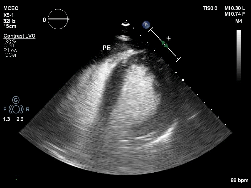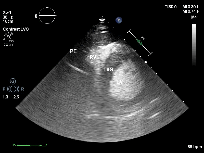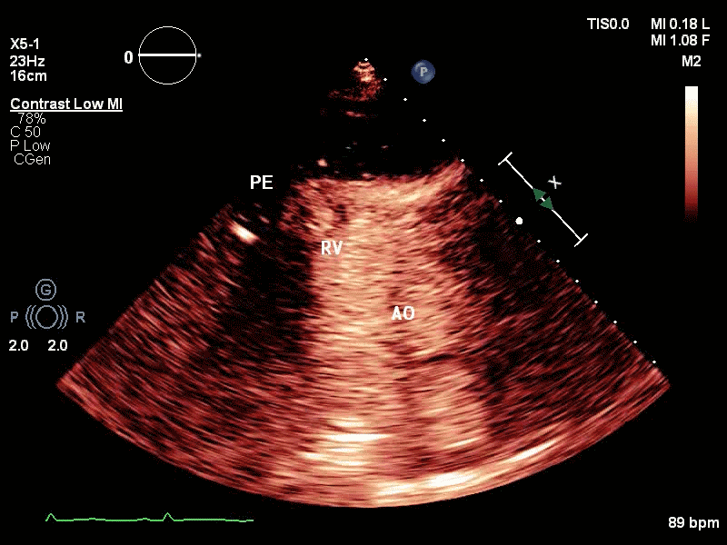 视频2 -3 : Contrast-Low MI模式下,心包腔内亦可见少量的造影剂回声。