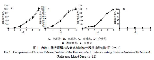 1 肠溶缓释片剂型是双层肠溶缓释片,片芯由含药的含药层与基座层压制而成,两个片层中都具有缓释材料,基座层不含有原料药,起承载、控释作用,通过调节含药层与基座层缓释辅料的种类和用量进而使得药物以一定的规律释放,片芯外包一层一定厚度的肠溶包衣使得药物仅在小肠中释放。结果表明,自制品与参比制剂在pH 1.0 盐酸中2 h内累积释放率均小于10.0%,符合中国药典2015年版关于肠溶缓释片体外释放的规定。自制小试样品与参比制剂在4 种介质中的释放曲线见图1。