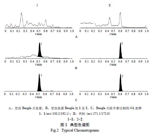 专属性:照“2.2.2”测定方法检测Beagle 犬空白血浆、空白血浆加1( 0.1 ng/ml) 与内标物2(0.1 ng/ml)、Beagle 犬口服参比制剂4 h 时的血浆样品。结果( 图2) 表明,1 和内标2 的相对保留时间分别为0.51 和0.60 min,分离较好,药物与内标