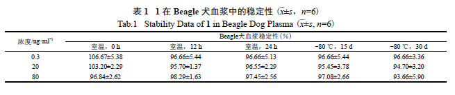 稳定性:低、中、高浓度(0.3、20 和80 ng/ml) 质控样品在室温下分别放置12 和24 h,然后照“2.2.2”项下血浆样品处理方法处理,分析测定血浆中药物浓度。同法配制质控样品,于-80 ℃冰箱中保存,分别测定15 和30 d 时的血浆中药物浓度,结果见表1。