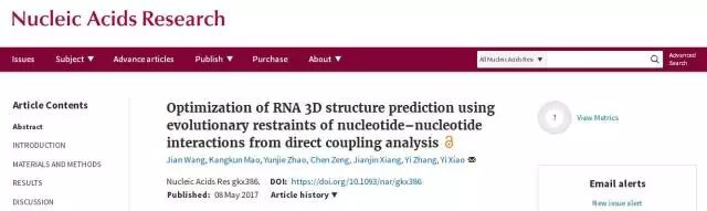 5月8日,核酸领域国际权威期刊《核酸研究》(Nucleic Acids Research)在线发表了物理学院生物物理研究所肖奕教授团队题为《通过直接耦合分析的核苷酸共进化信息对RNA三级结构进行优化》(Optimization of RNA 3D structure prediction using evolutionary restraints of nucleotide-nucleotide interactions from direct coupling analysis)的论文,报道了一种利用共进化信息提高非编码核糖核酸(RNA)三维结构预测精度的方法。物理学院博士生王剑为论文第一作者,肖奕教授为论文通讯作者。