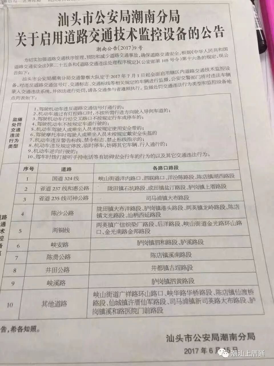 网友报料:从现在开始交警中队对省道237线,汕头市潮南区胪岗镇上厝路段和惠路一带进行乱停乱放违章【严管】抓拍处罚!(7月1日开始)上厝路段和惠路一带司机驾驶员没有系带安全带的,也进行抓拍扣分处罚!