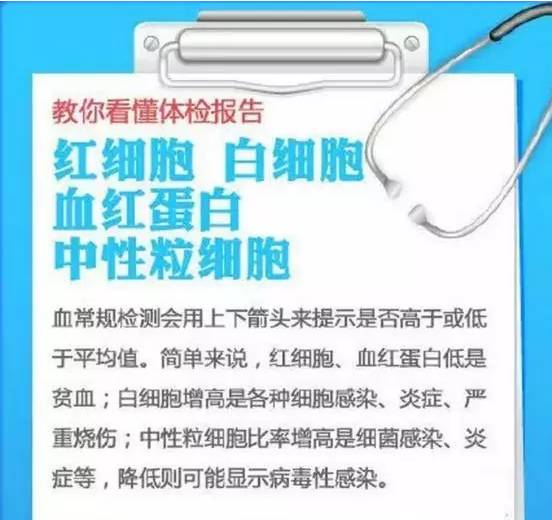 ↑ 偏高:说明身体可能有炎症,如扁桃体炎、肺炎、阑尾炎等,如果白细胞高得太多,则有可能跟血液病有关,应到医院血液科做进一步检查。