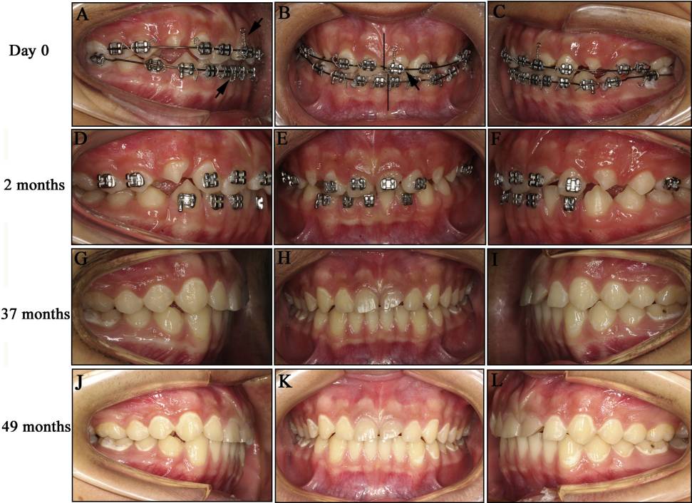 Fig 2. 放置正畸托槽后的口内照片: A-C, 第0天; D-F, 2个月; G-I,37个月; and J-L, 49个月。结扎丝被弯曲以供橡皮圈插入 (A图箭头).两侧上颌中切牙都折断了:右侧中切牙向近中侧折断,左侧中切牙失去了三分之一 (图 B箭头)。 上颌牙齿中线与面中线一致,下颌牙齿中线偏移2mm(图B的竖线表示上下颌牙列中线)。治疗后两个月(D-F), 牙列中线一致(E)。在治疗后第37和49个月,牙列中线依然保持一致,咬合维持稳定 (G-L)。