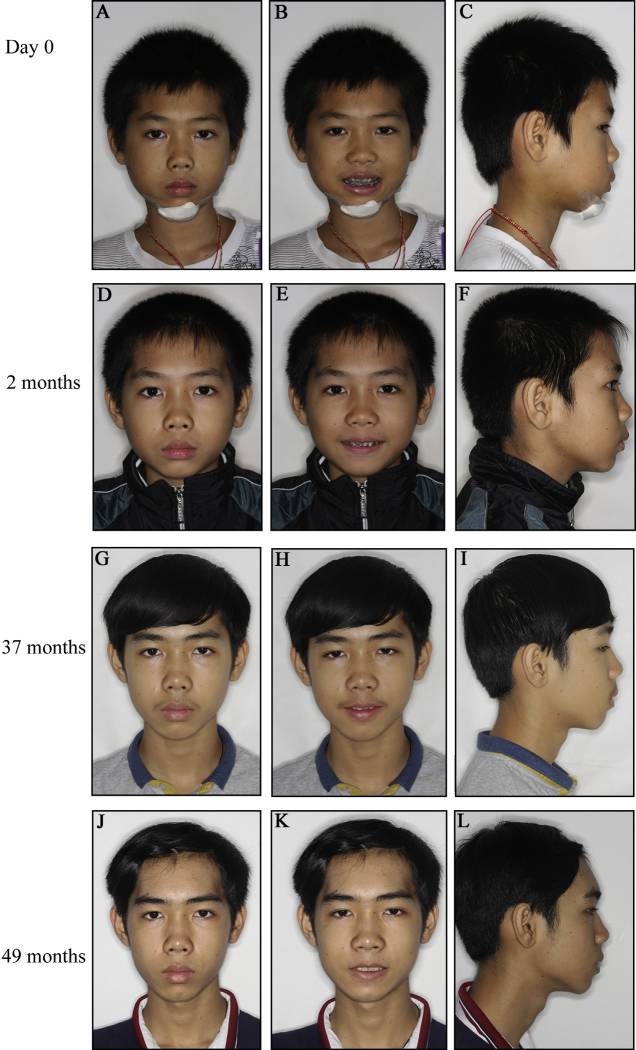 Fig 1. 治疗过程中患者的面部图像: A-C, 第0天; D-F, 2个月; G-I, 37个月; 和J-L, 治疗后49个月。 在第一次治疗后颊部撕裂伤得到清创、治疗,并以纱布包扎(A-C). 在第一次面诊时可以观察到患者面部下颌中线向左偏移2mm(A和B). 在两个月时观察到面部已经对称(E) 并且在第37和49个月时依然保持对称 (H和K). 在治疗后第49个月复诊时,患者已经14岁零10个月了。此时患者显示出明显的青春期生理特征,例如在治疗后37个月时面部上唇部出现胡须(G-I)。