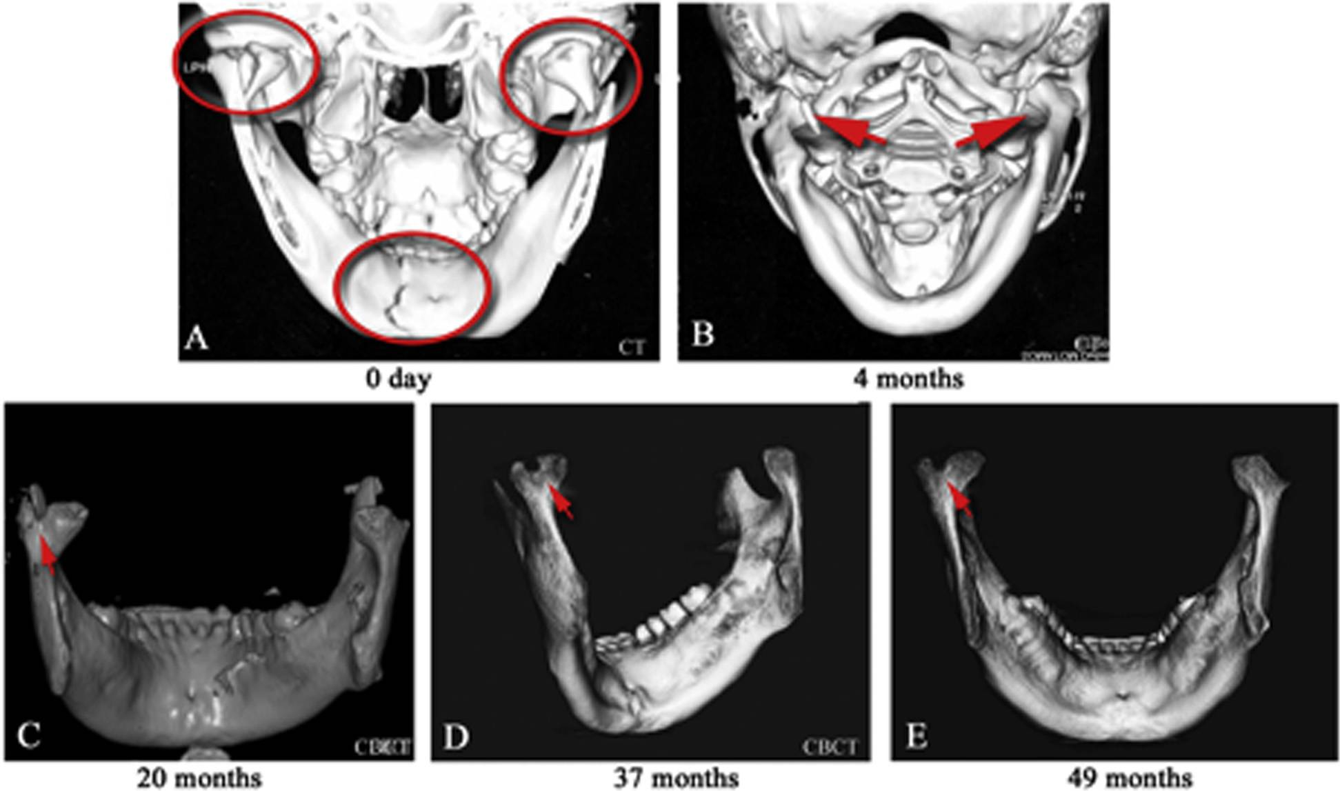 Fig 3.计算机断层扫描显示的下颌骨冠状面影像: A,治疗前; B,治疗后4个月; C, 治疗后20个月; D, 治疗后37个月; E, 治疗后49个月。在治疗前的计算机断层扫描中观察到,左侧髁头的垂直型骨折,右侧髁颈部的移位性骨折和正中联合部的骨折(图A红圈部分)。治疗后四个月,左右侧髁突愈合明显 (图B箭头)。到治疗后的第20个月,双侧正在愈合的髁突向内轻微移位,形成了可见的切迹 (图C箭头)。到治疗后第37和49个月右侧髁突显示痊愈 (D 和E); 左侧髁突依然可见V型小切迹(图 D 和E箭头).