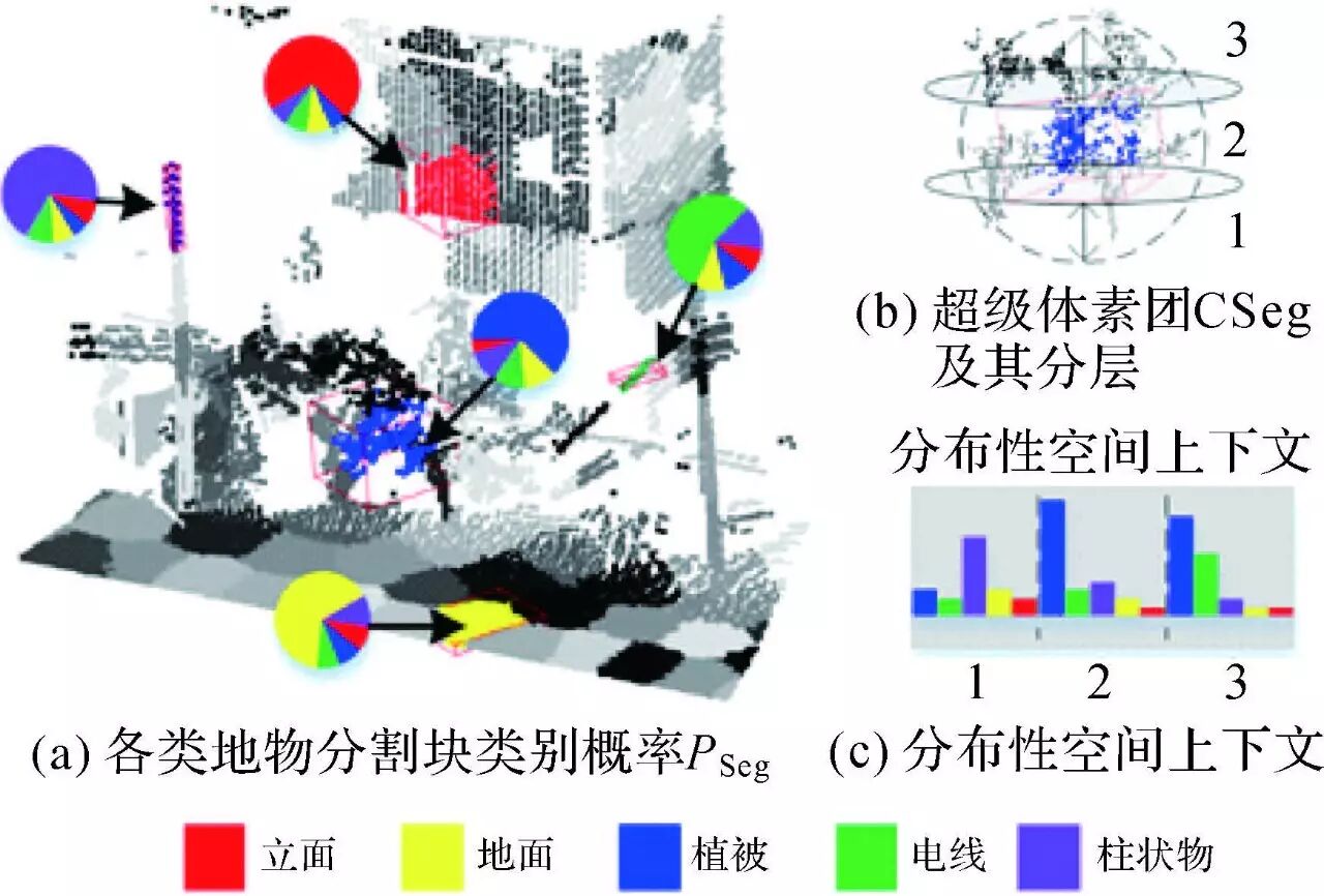 本文将每个超级体素Segi看作单一实体,利用随机森林 (http://docs.opencv.org/2.4/modules/ml/doc/random_trees.html) 分类方法,对超级体素实体进行软分类,得到Segi的类别概率p(l), l为Segi的类别,统计得到Segi的类别概率分布pSegi,如图 3(a) 中各超级体素饼状图所示。为得到地物在垂直方向上的空间分布,以Segi中心点为中心,取半径为1.5r的球状邻域, r为超级体素直径,组成超级体素团CSegi,如图 3(b) 所示。为便于精确统计,引入文献[9]中空间相关性划分的思路,将超级体素团中超级体素,按中心点高程,划分成3部分Partf