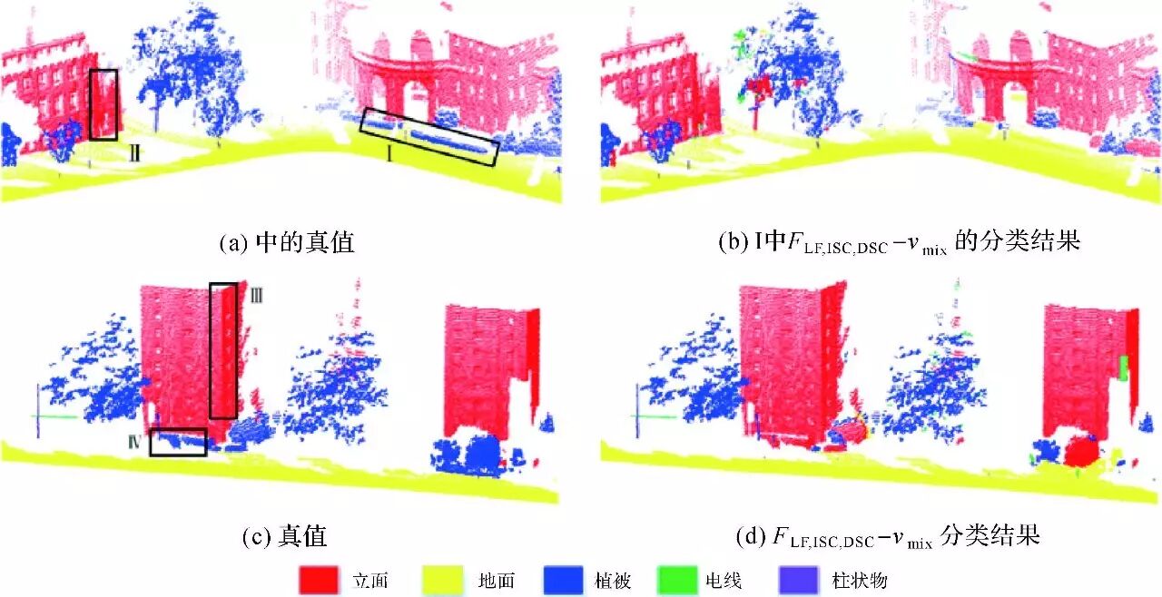 表 2展示了本文方法对测试数据分类的结果,整体准确率达到97.59%,图 8为本文方法分类结果与真值的比较图。从表 2中可以看到,除电线由于分布不稳定造成准确率较低外,各类地物均有较高准确率。误分情况主要集中在植被与立面:①靠近地面的低矮植被,如花草等,被误分为地面 (如图 8区域Ⅰ所示);②部分经人工修剪的植被,竖直方向上表现较为平整,被误分为立面 (如图 8区域Ⅳ所示);③部分立面点分布不稳定,被分成了植被、电线点;④由于电线、柱状物等在场景中属于尺寸较小的地物,容易与较浓密植被相混合,造成电线点、柱状物点被误分为植被。
