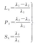 式中,λ1、λ2、λ3(λ1≥λ2≥λ3≥0) 为v内邻近点集的协方差矩阵的特征值。