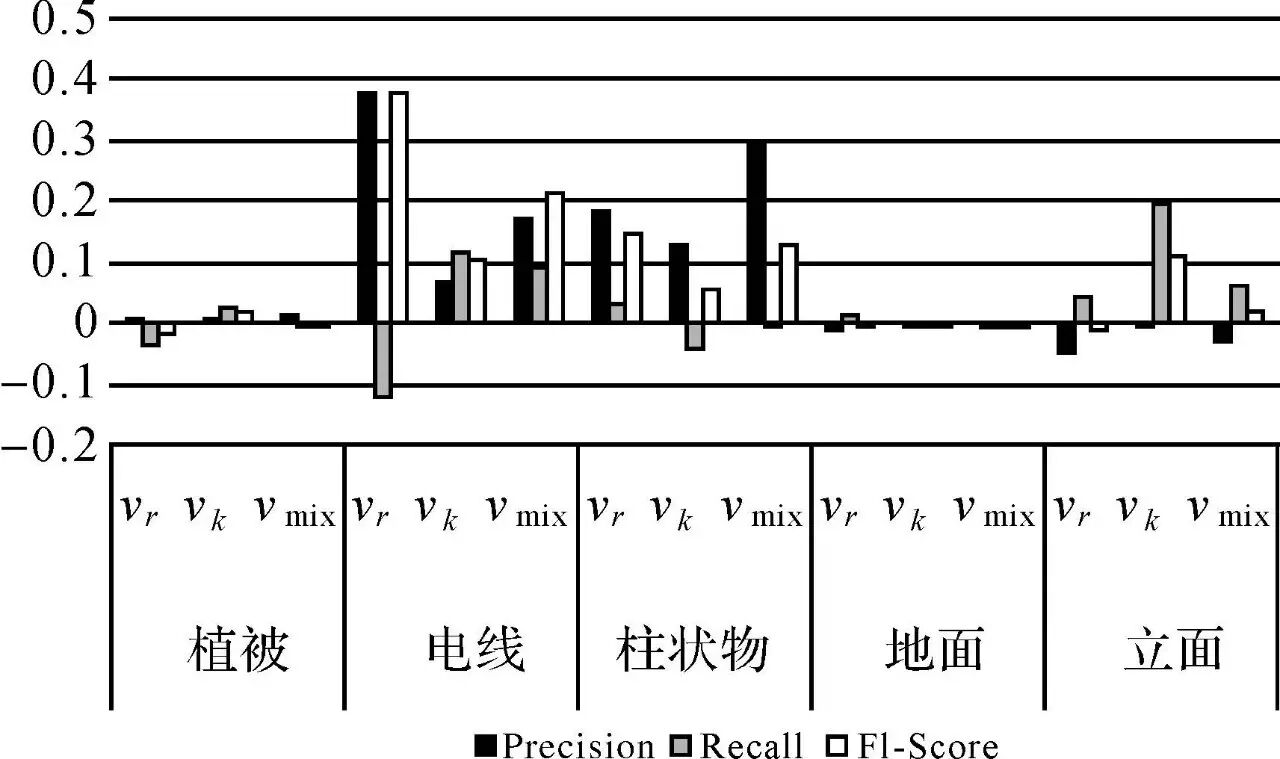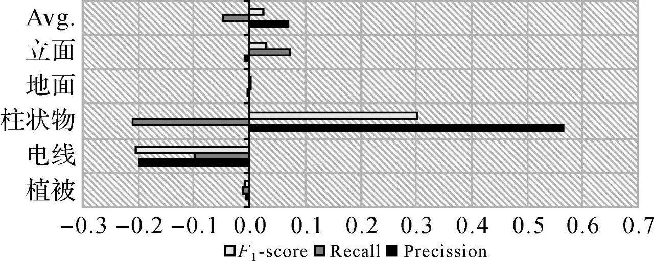 如图 9所示,在同一自适应邻域方法中,分布性空间上下文的使用,可以有效提高点云分类的整体准确率。图 10为两类特征组合分类结果的对比差值。从图 10中可以看到,对于同一自适应邻域,分布性空间上下文能够有效提升电线、柱状物以及立面的部分评价指标。电线及柱状地物,数据不足总体1%,大量的稀疏立面点、地面点,呈水平线状分布,容易被误分为电线点,而建筑物立面相交处,点较为密集,容易误分为柱状物,使得电线及柱状地物的准确率通常较低,而从图 10中可以看到,分布性空间上下文能够有效提高电线、柱状物的准确率、F1-score,得到较为合理的结果。