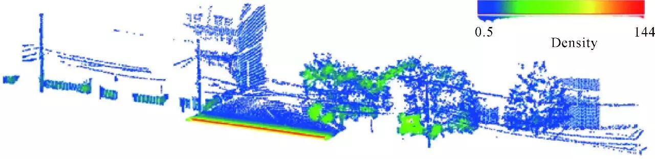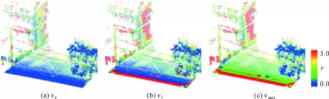 从图 5中可以看到,点云数据中密度分布十分不均。单一的邻域vk在密度较大的地面区域,半径往往偏小,如图 7(a)所示,使得vk呈线性分布。单一的邻域vr,参数r需要满足场景中不同地物的尺度,因此需要较小的rmin,这使得在密度与曲率都较小的区域,容易造成vr呈线状分布,且在曲率较大的植被区域有较大的邻域,如图 7(b)所示。vmix以曲率为阈值,如图 6所示,cur>0.02的部分使用邻域vk,cur<0.02的部分使用邻域vr,使估算的邻域避免点云密度及曲率变化的影响。从图 7(c)中可以看到,vmix在曲率较小的区域具有较大的半径,在曲率较大或变化剧烈的区域半径较小,有效避免同类型地物由于密度变化导致的邻域半径变化。