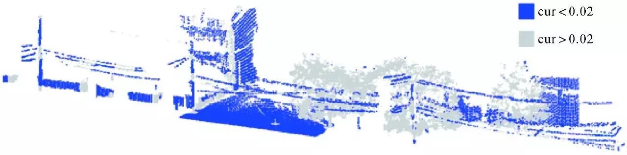 点的邻域通常是以该点为中心,在一个半径为r的球体内,所包含的其他所有点,或者是点云中与该点距离较近的前k个点。显然,邻域的确定主要依赖于k或r,而k或r的确定往往需要一定的先验知识。在地物复杂的场景中,受点云数据密度不均匀的影响,固定尺度的邻域难以有效地描述地物的局部特征,这就需要根据地物表面的复杂程度,自适应地调整特征估算时的邻域范围。本文针对的是地面移动三维激光扫描仪所获取的点云数据,数据呈线状分布,具有密度不均的特点,线状分布在面状区域表现尤为明显,如图 1所示。从点云数据中可以清楚地看出,点云邻域的大小与点云密度及曲率有关,因此自适应的邻域选取方法可以从这两方面入手。目前应用较为广泛的是基于最小熵值的邻域估算方法,其中以k为参数的最小熵值法[11],得到邻域为vk,以半径r为参数的最小熵值法[14],得到邻域为vr。邻域vk虽然避免了对场景的先验假设,但其受点云密度影响较大,在平坦区域vk会呈线状分布,如图 1所示。邻域vr能够减小点云密度的影响,但需要对场景中的地物类型有一定了解,且受曲率影响较大。本文提出一种顾及曲率的自适应邻域方法,如式 (1) 所示,以曲率为阈值,曲率较大的使用邻域vk,曲率较小的使用邻域vr,得到的邻域为vmix