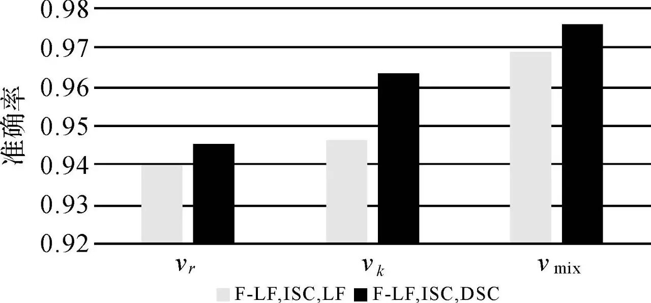 各试验的整体准确率如图 9所示。本文的自适应邻域方法vmix,顾及点云场景中曲率较大和较小两种区域,得到更合适的邻域,从而提高分类精度。如图 9所示,对于不同的特征组合,相较于vk、vr,基于vmix的分类方法的整体准确率都有显著提高。