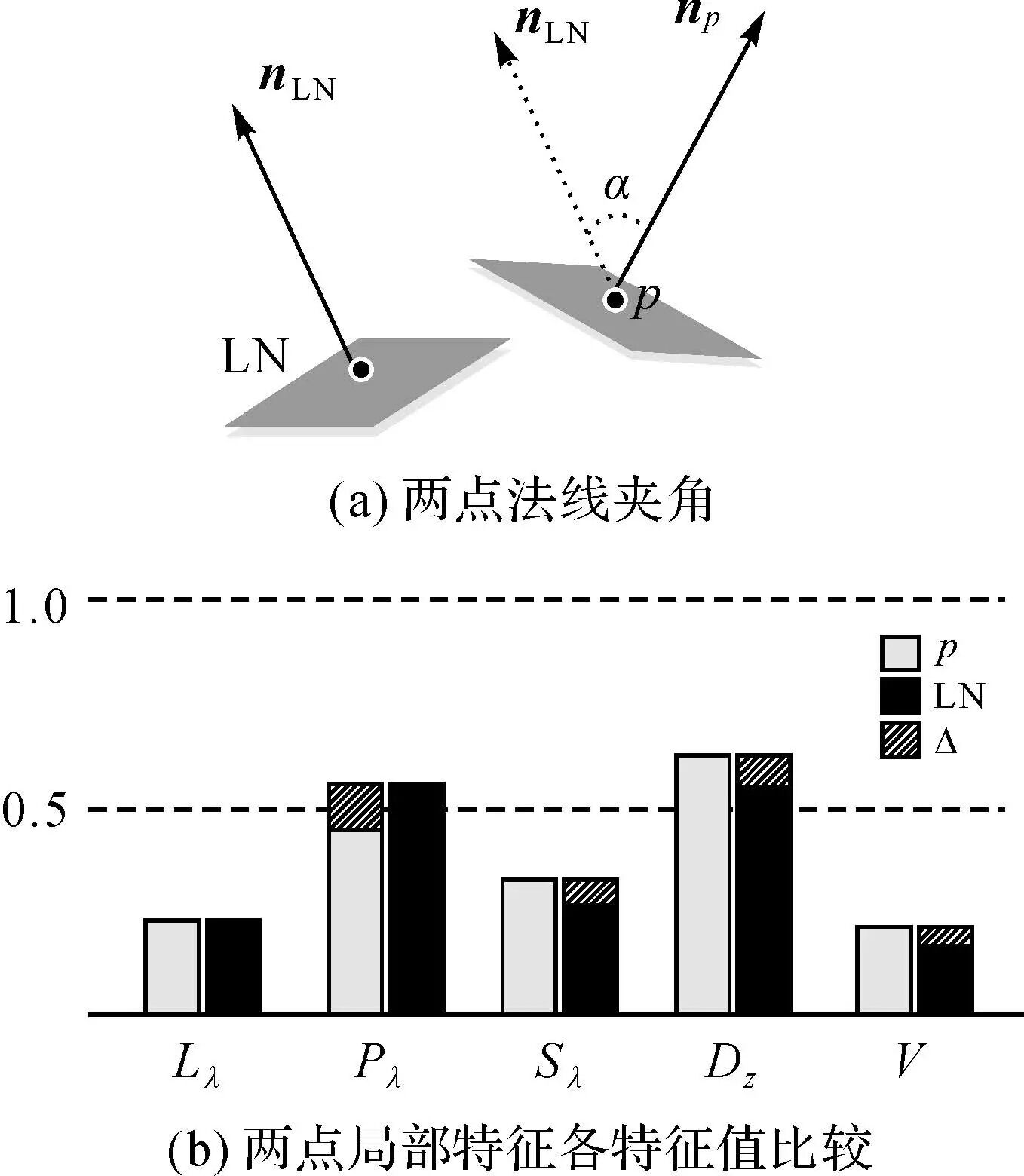 式中,np与nLN分别为p点、LN点的法向量;Δ项为单点局部特征值的差值。