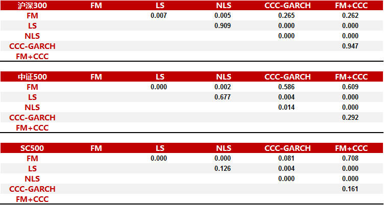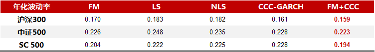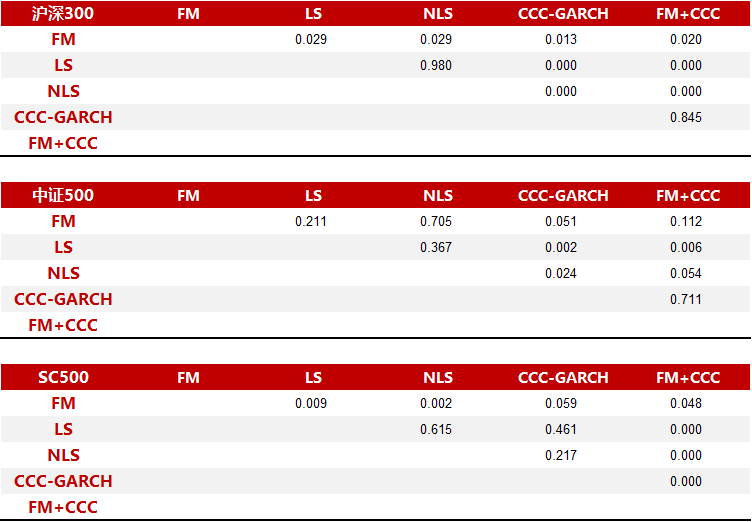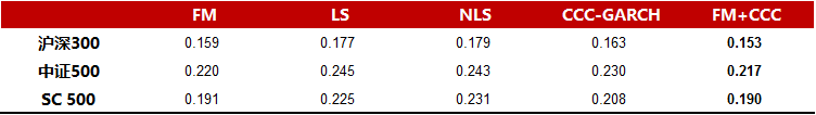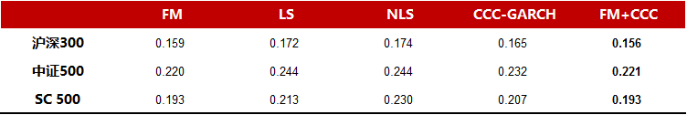CCC-GARCH和FM互有胜负,沪深300内CCC-GARCH比FM好,且差异在统计上显著;SC500内FM比CCC-GARCH好,且差异在统计上显著。如果把两者等权合在一起(FM+CCC),会发现其GMVP波动率数值在不同成份股内都是最小,虽然有时候这种数值差异在统计上不显著。
