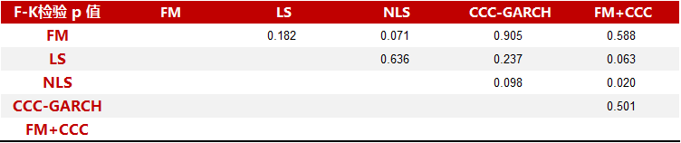 不同模型之间对比来看(图4,图5),和之前月频结果比较类似。加了时变结构的FM和CCC_GARCH要比纯横截面改进的LS和NLS模型要好,把FM和CCC_GARCH组合在一起得到GMVP组合波动率数值更小,但和单个模型的差异在统计上不显著。