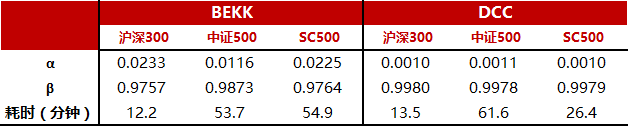 鉴于DCC和BEKK模型的耗时,我们可以考虑采用DCC模型的一个简化版本CCC GARCH,它假设DCC模型中的条件相关系数矩阵是一个常数矩阵,不随时间变化,条件协方差的变化完全由个股条件方差的变化引起。这样估计参数时,只需要对每个股票做时间序列上的一维GARCH模型拟合,然后计算devolatised return的相关系数矩阵即可,计算量大幅降低。图1在A股估计得到的DCC模型alpha很小,