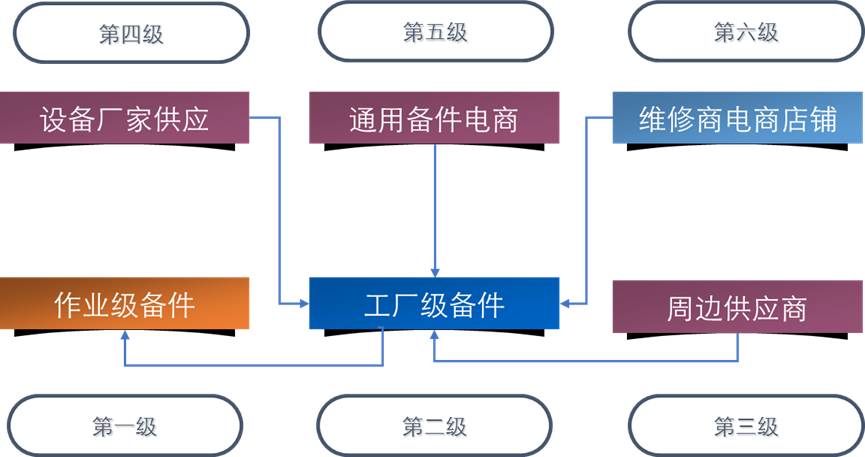 备件犹如治病的药,企业不可能储备所有的备件,必然依靠多渠道获取到备件。这就给备件的“电商”应用创造了无限的商机,由于维修整体而言属于低频应用,而且针对故障的备件种类繁多,却又很难做成大的电商平台。结合企业实际情况与备件供应市场,建立六级备件供应生态体系。