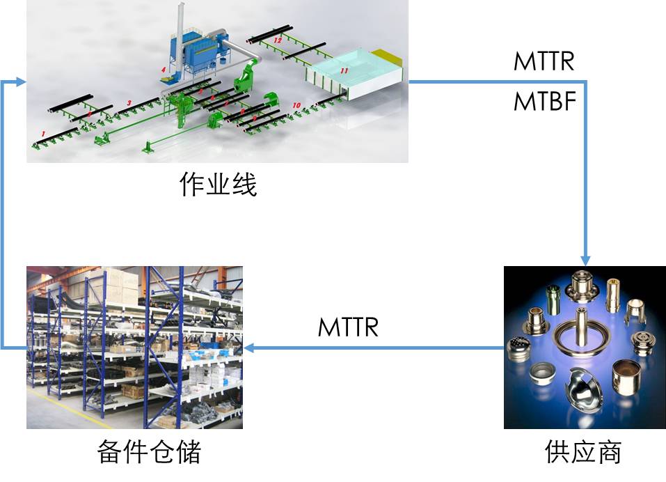 从上图可以看出,作业线的可用度MTTR和MTBF决定了备件需求的周期频次和数量。反过来,备件满足的及时性,又影响作业线的MTTR。