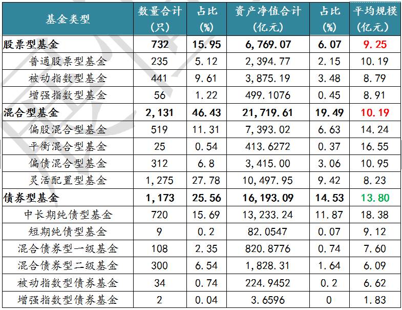 截止目前,公募基金规模合计107011.93亿元,数量合计4590只,虽然数量较10月底增多,但规模有所减小。其中,偏股型基金的平均规模微增,偏债型基金的平均规模微降。