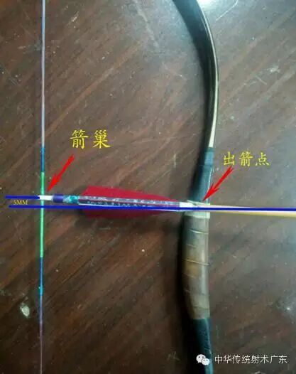 由于传统弓没有箭台,是使用手指作为箭台,很多人在射箭的时候会划伤手,一般情况下除了箭的羽梗没有做保护措施加上羽梗制作粗糙或者缠羽梗的线太粗会造成划伤外。箭巢必须高于出箭点,才能有效保证手指不会划伤,至于高多少根据弓与箭的不同或者个人习惯会造成一些差异,一般情况下,我推荐箭巢要保证让箭尾高于出箭点处5MM左右。