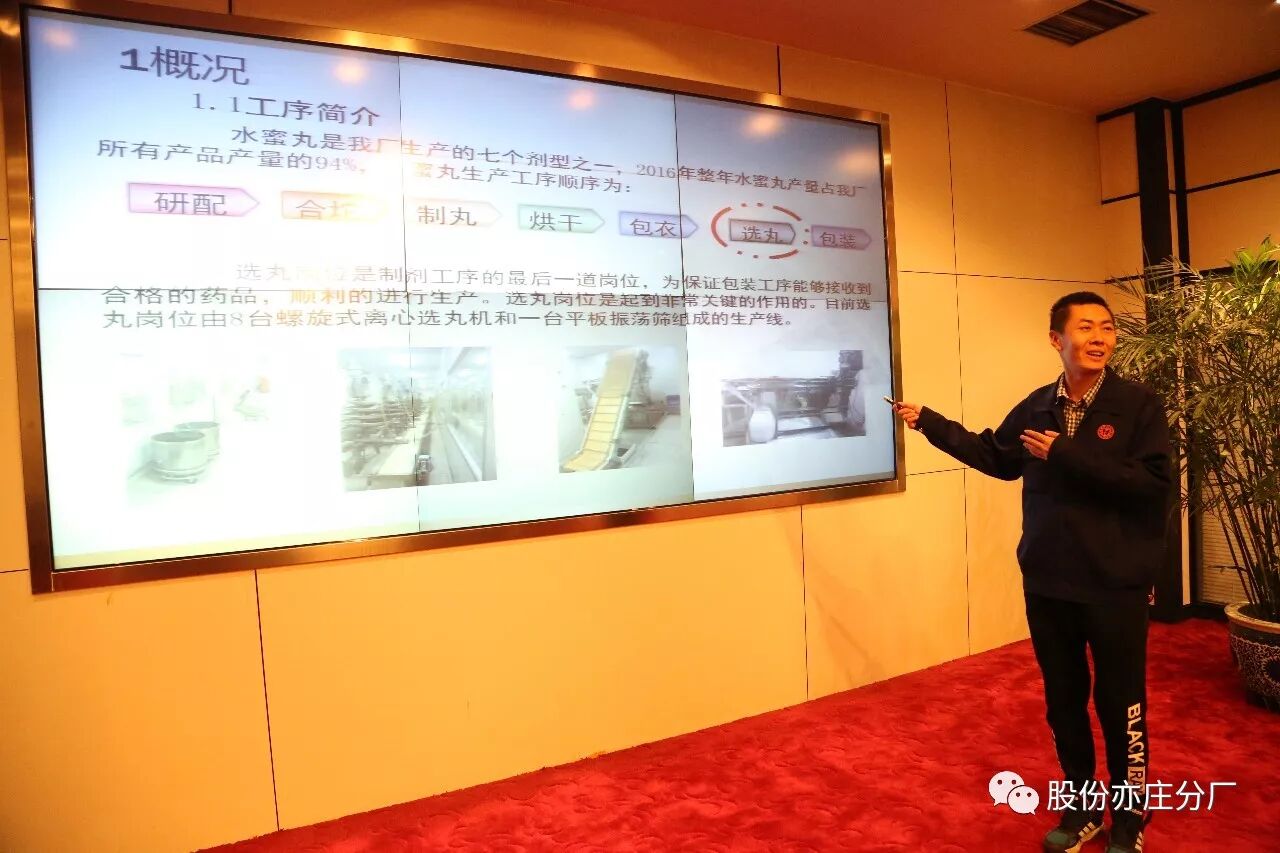 小丸车间烘干包衣QC小组的发布者张文强,发布他们的QC课题《提高坤宝丸选丸生产效率》。