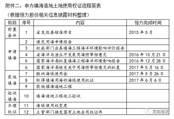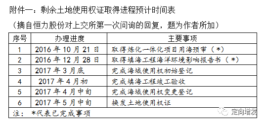 二、。2017年2月18日恒力股份在对上交所一次问询的回复中披露,本项目需通过填海方式取得的277.51万平方米土地使用权证预计将于“2017年4月初完成填海工程竣工验收”、“2017年5月中旬换发土地使用权证”(参见附件一:剩余土地使用权证取得进程预计时间表)。可是,直到8月底这份土地使用权证依然没有取得。据2017年8月24日公告的新版报告书摘要披露,本项目“尚有277.51万平方米未取得土地使用权证”。土地使用权证取得时间表“晚点”了!原计划5月中旬取得的土地使用权证没有如期取得,只取得了“填海用海的海域使用权”,两者之间隔了缴纳使用金、填海造地、填海造地工程竣工验收和变更海域使用权等众多站点(参见附件二:申办填海造地土地使用权证流程简表)。但是,新版报告书只字未提“晚点”。对“晚点”究竟有多严重、因何而造成、土地使用权证申办进程下一步走势会怎样等投资者关心的问题,报告书也是滴水不漏。!因为项目建设用地使用权证的取得不仅影响本项目进程、而且关系本项目成败,在恒力宣布投产时间要从2019年一季度提前到2018年四季度的今天,尤其如此。