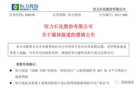 此文刊发后的第二天,9月12日晚间,恒力股份发布了《关于媒体报道的澄清公告》,重点强调:恒力炼化“2000万吨/年炼化一体化项目”已取得面积为367.79万平方米的土地使用权,恒力炼化未取得土地使用权的土地已取得填海海域的不动产权证书,公告全文小伙伴们请自行下载。