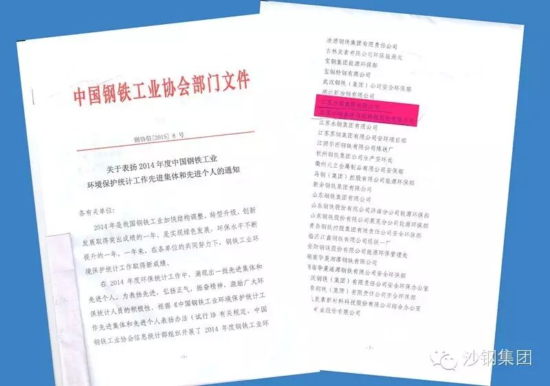 本报讯(通讯员 施永杰 陈大江)日前,从中国钢铁工业协会传来好消息,沙钢集团有限公司荣膺“2014年度钢铁工业环境保护统计工作先进集体”,这是沙钢连续5年获得该项荣誉。