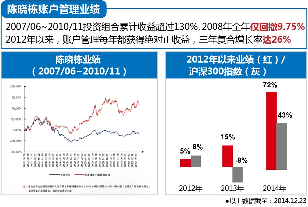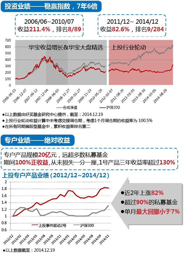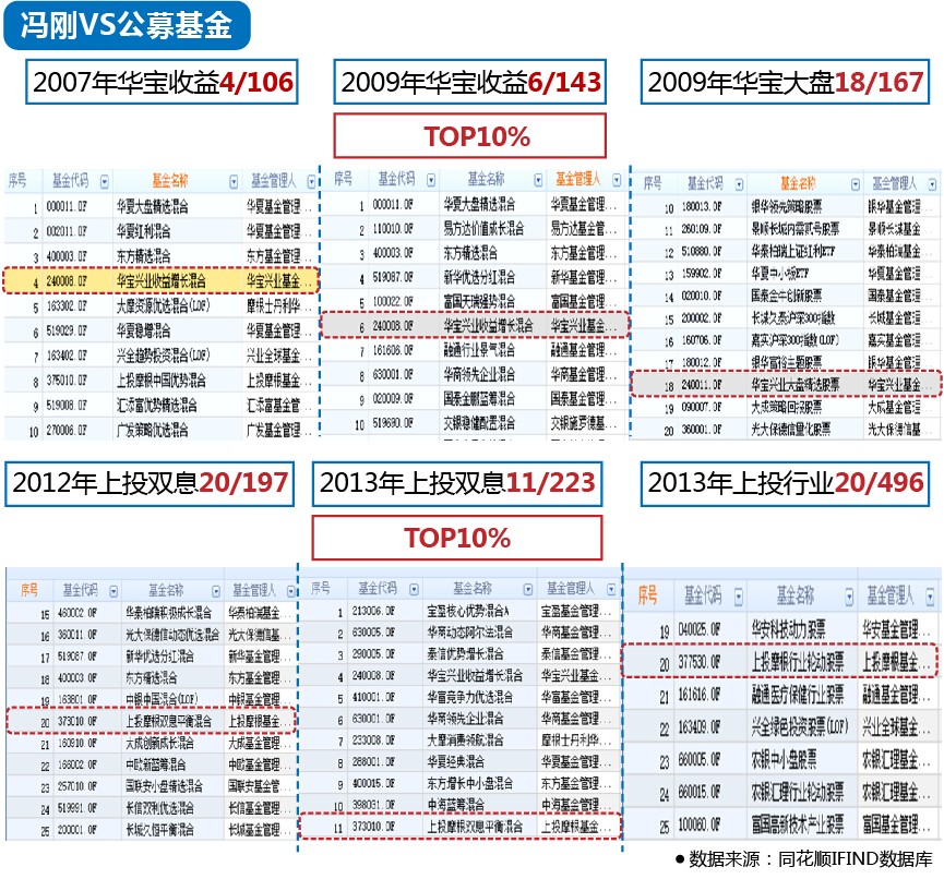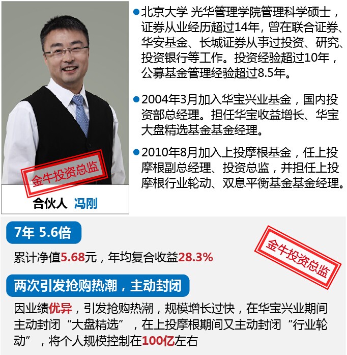冯刚:曾任上投摩根基金管理有限公司副总经理、投资总监、基金经理,长期负责公司投资研究,带领上投摩根基金业绩突飞猛进,2011 年,上投摩根旗下偏股型基金排名全线上升 ,2013 年,上投摩根获“金牛基金公司”,股票投资能力排名第二,离任时公司旗下股票团队整体管理规模近 800 亿元。 作为基金经理期间,曾四次获得金牛基金,在不同公司、不同时间、不同市场环境下管理的华宝收益增长基金、华宝大盘精选基金、上投行业轮动基金、上投双息平衡基金穿越牛熊市、历经大小盘风格,业绩均排名靠前 1/4,管理过的每只基金都获得了 60%以上的正收益,均大幅跑赢同类平均水平。