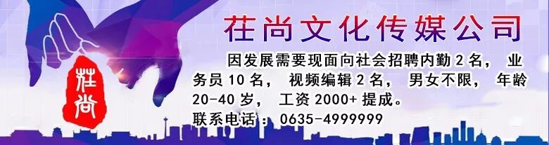 | 10 | 【招聘】茌尚传媒公司因发展需要现面向社会招聘内勤2名,业务员10名,视频编辑2名,男女不限,年龄20-40岁,工资2000+提成。联系电话:06354999999 |