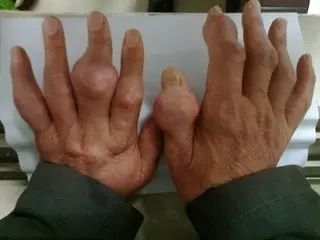 皮下痛风石和慢性痛风石性关节炎是长期显著的高尿酸血症,大量单钠尿酸盐晶体沉积于皮下、关节滑膜、软骨、骨质及关节周围软组织的结果。皮下痛风石发生的典型部位是耳郭,也常见于反复发作的关节周围及鹰嘴、跟腱和髌骨滑囊等部位。外观为皮下隆起的大小不一的黄白色赘生物,皮肤表面菲薄,破溃后排出白色粉状或糊状物,经久不愈。皮下痛风石常与慢性痛风石性关节炎并存。关节内大量沉积的痛风石可造成关节骨质破坏、关节周围组织纤维化和继发退行性改变等。临床表现为持续关节肿痛、压痛、畸形及功能障碍。慢性期症状相对缓和,但也可有急性发作。