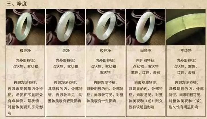 底指的是翡翠絮状物(又称棉),黑斑,其它色斑的多少程度。由于翡翠是多种矿物的集合体,其结构多为纤维状结构和粒状结构,杂质的多少程度也必然影响翡翠的价值。