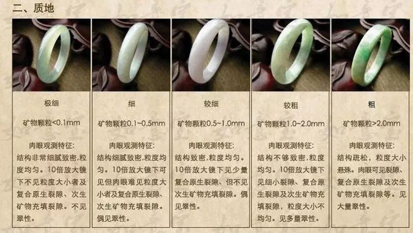 事实上,翡翠的结晶体颗粒大小和这些颗粒的交结关系是决定翡翠商业品种的主要原因,并由此制定出以下分级标准: