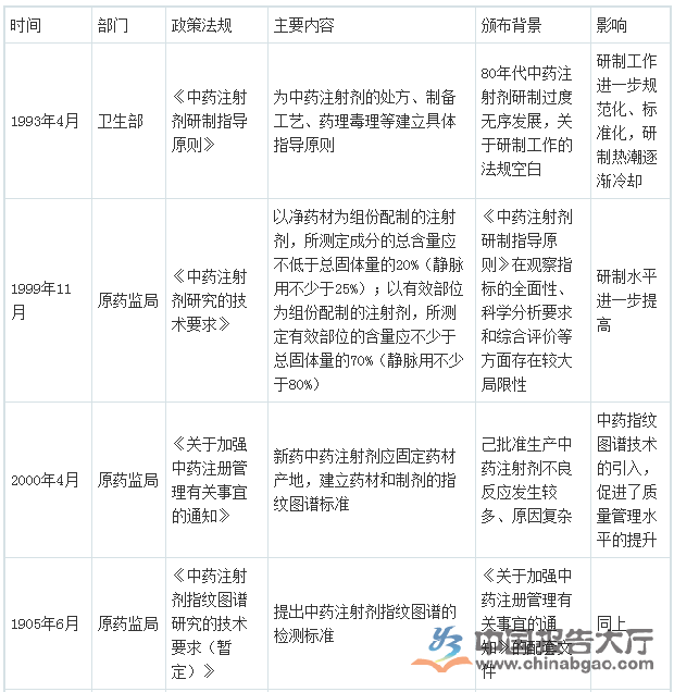 2007年12月颁布的《中药、天然药物注射剂基本技术要求》和2009年1月颁布的《中药注射剂安全性再评价工作方案》对于我国中药注射剂行业的影响最为深刻。行业理念政策汇总如下: