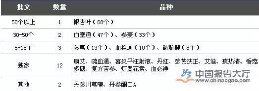 在市场排名前20种注射剂中,独家品种有12个,比重高达60%,批文在50个以上的只有银杏叶1个。