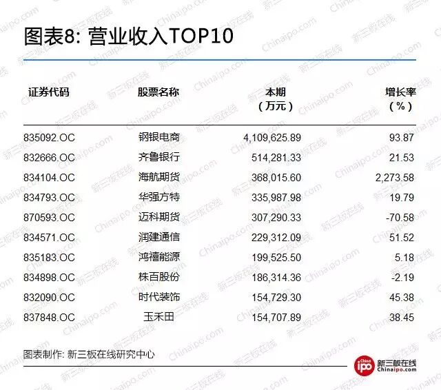 3月27日至3月31日,新三板共有844家挂牌企业公布了2016年度财务报告。其中624家企业营收呈现正增长,另有220家公司出现了营收下降。正增长企业占比73.93%。营收排名前三的是钢银电商、齐鲁银行和海航期货,营收分别为410.96亿元、51.42亿元和36.8亿元。