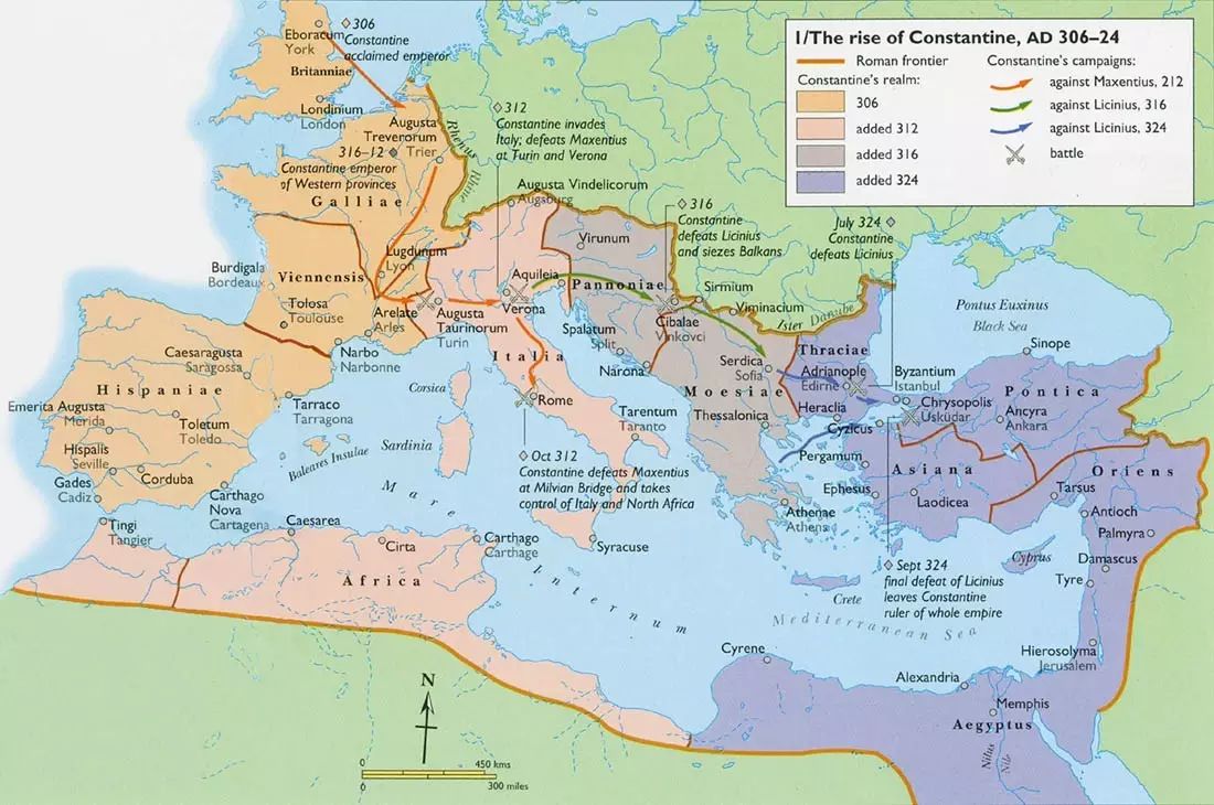 君士坦丁一世也被认为是东罗马帝国(拜占庭帝国)的建立者,他一手在亚欧大陆交界处建立新都城(当时称新罗马、君士坦丁堡,即今天的伊斯坦布尔)。不过罗马帝国自三世纪起就内争不断和外敌入侵,国力衰落,虽然后来有过像君士坦丁一世这样伟大的皇帝,但到了公元395年,罗马帝国还是无可挽回地分裂为东西两半。公元476年,北方来的日耳曼蛮族灭亡以“永恒之城”罗马为首都的西罗马帝国,东罗马帝国一直持续到1453年才亡于奥斯曼土耳其。