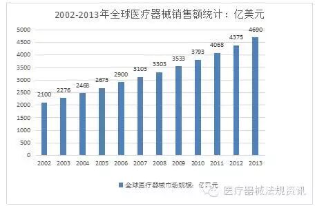 据欧盟医疗器械委员会的统计数字,全球医疗器械市场销售总额已从2002 年的2,100亿美元迅速上升至2013年的4,690 亿美元,年复合增长率达7.58%,全球医疗器械市场增长率超过同期GDP 增幅。