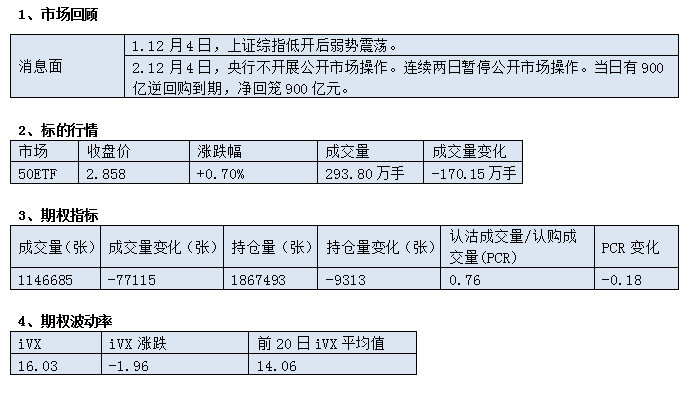 12月4日,50ETF低开后震荡上扬,较前一交易日缩量收涨0.70%,报2.858,结束之前的连续五日收阴。从期权PCR指标来看,期权投资者避险情绪较前一交易日回落。上证综指低开后弱势震荡。50ETF波动率指数(iVX)较前一交易日回落,收16.03%。资金面上,,目前银行体系流动性总量处于较高水平,可吸收央行逆回购到期等因素的影响,12月4日不开展公开市场操作。连续两日暂停公开市场操作。当日有900亿逆回购到期,净回笼900亿元。Shibor涨跌不一,短期品种下行。