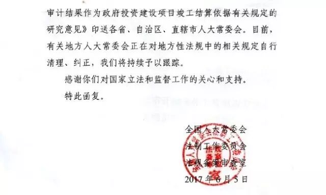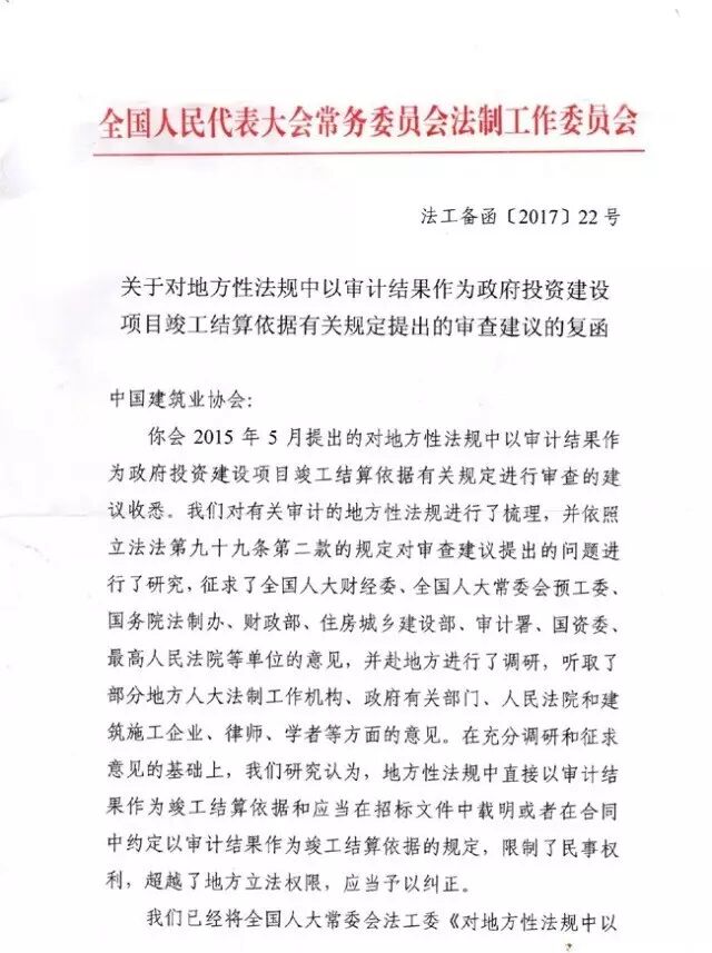 全国人大常委会法工委日前在回复中国建筑业协会《关于对地方性法规中以审计结果作为政府投资建设项目竣工结算依据有关规定提出的审查建议的复函》中提出,地方性法规中直接以审计结果作为竣工结算依据和应当在招标文件中载明或者在合同中约定以审计结果作为竣工结算依据的规定,限制了民事权利,超越了地方立法权限,应当予以纠正。且法工委已将研究意见印送各省、自治区、直辖市人大常委会。目前,有关地方人大常委会正在对地方性法规中的相关规定自行清理、纠正。