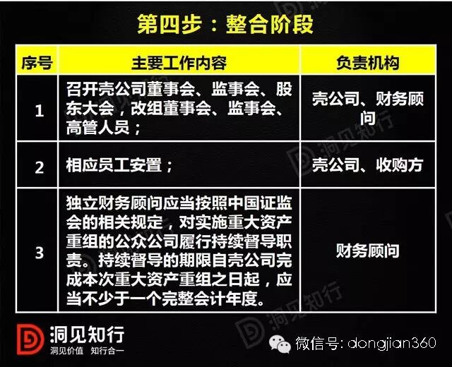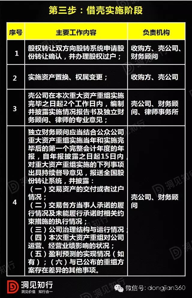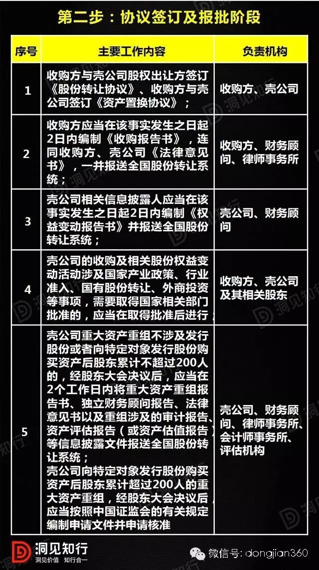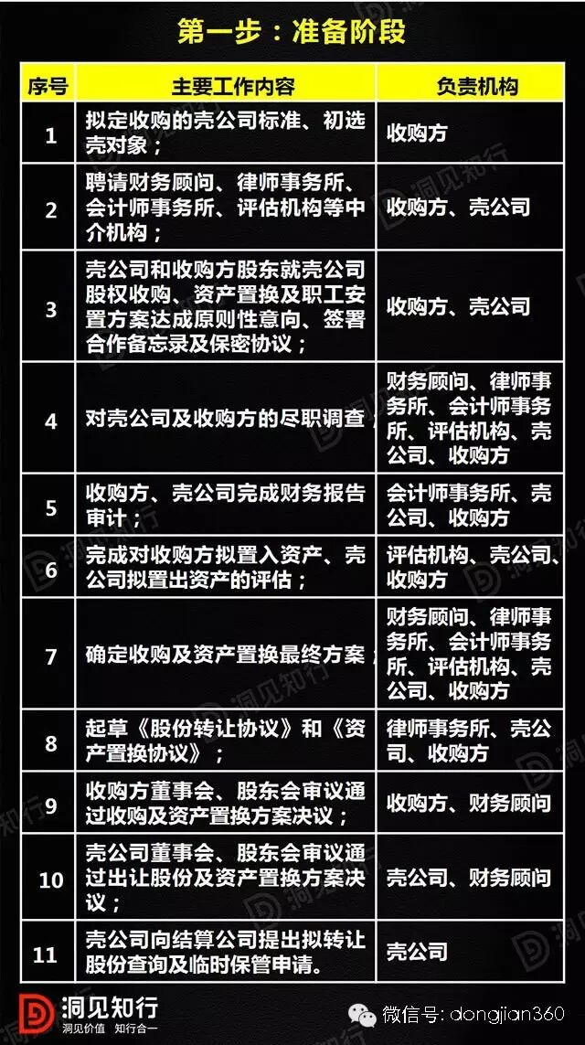 新三板“借壳”可以分为四步:准备阶段——协议签订及报批阶段——借壳实施阶段——整合阶段