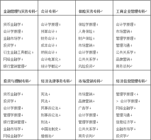 1.高中起点专科:金融管理与实务、会计、保险实务、工商企业管理、市场营销、经济法律事务、投资与理财、经济信息管理、工程造价。