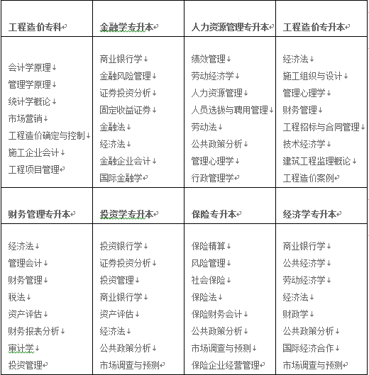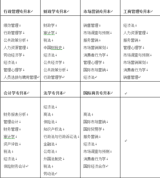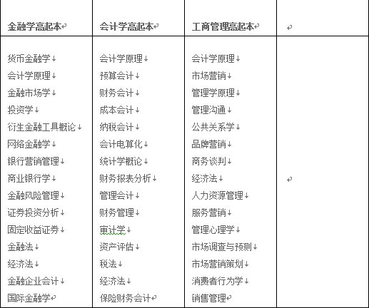 3.专科升本科:金融学、财政学、会计学、财务管理、保险、工商管理、市场营销、经济学、行政管理、人力资源管理、法学、投资学、国际商务、工程造价。