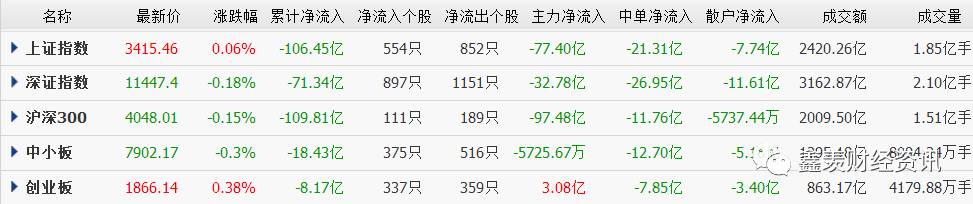 周三沪深两市股指集体小幅低开,随后两市进入震荡走高的格局,午后两市的走势突然转变,集体拐头向下走低。盘面上360概念依旧一枝独秀,其他板块则出现不同程度的回落。截至收盘,沪指上涨0.06%,报收3415点;深成指下跌0.18%,报收11447点;创业板上涨0.38%,报收1866点。从盘面上看,360概念、券商、传媒等板块涨幅居前;芯片、超级品牌、采掘服务等板块跌幅居前。