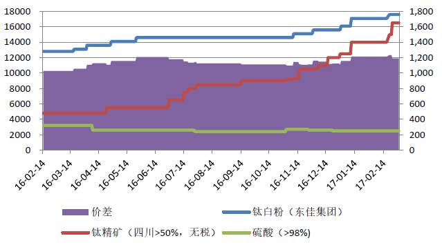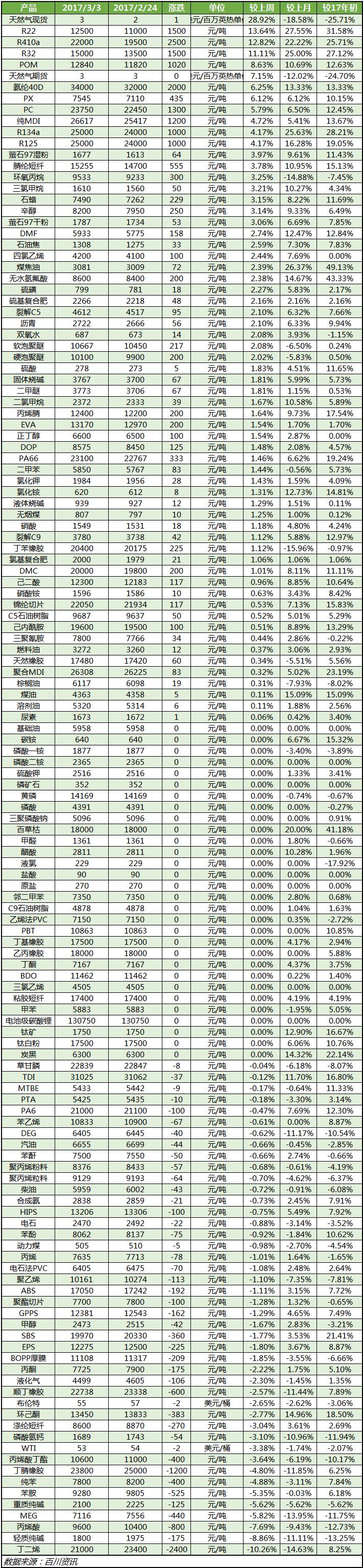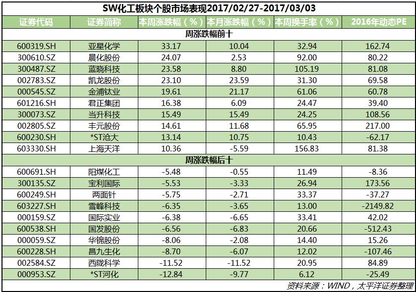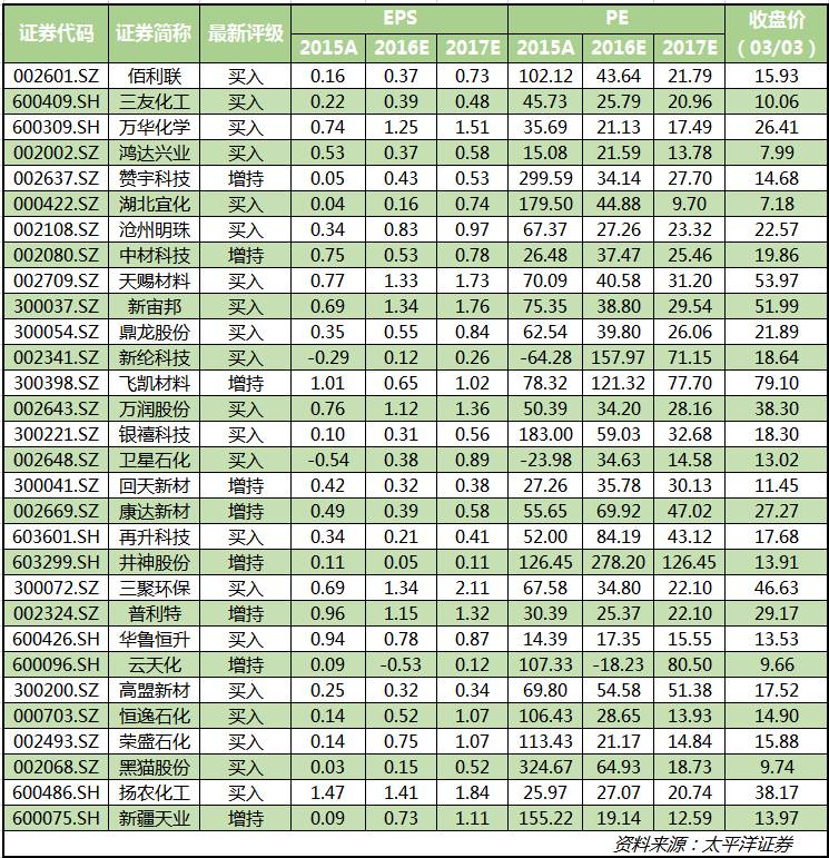 本周百草枯主流成交报价上涨至20,000元/吨,成交价上涨至在17,500-18,000元/吨左右,主流供应商开工充足,现货供应紧张,出口形势良好,与我们之前判断的一致,我们认为此轮百草枯价格上涨主要源于吡啶原材料端的价格上涨(已从去年12月初的15,000元/吨涨至目前的18,500元/吨),以及整个行业市场集中度的提升,我们重点推荐吡啶-百草枯行业龙头红太阳,公司吡啶碱总产能达到6.2万吨,位居全国第一,其中吡啶产能4.1万吨,3-甲基吡啶为2.1万吨,而目前市场上仅有1.2万吨的量,公司百草枯胶剂预计今年国内销售1.5万-2万吨,我们看好公司对吡啶产业链的深度整合及产品定价权的牢牢掌控。上周草铵膦成交价格保持在155,000-160,000元/吨,高端价格上涨至180,000元/吨,目前市场看华北和西南的主流生产商开工相对较高,而订单较为充足,短期内市场将维持供应紧张的态势,同时草铵膦生产技术难度高,环保污染压力大,国内拥有较好生产工艺厂商只有数家。我们认为草铵膦未来有望填补百草枯水溶剂在国内禁售后的市场份额,尤其是两广地区的经济作物应用前景广泛,继续重点推荐利尔化学。麦草畏目前主流市场成交价在10,000-110,000元/吨左右,我们看好未来孟山都双抗种子的推广种植引起的麦草畏市场大幅增长,继续重点推荐目前产能5,000吨,年内将投放20,000吨产能的扬农化工和具备产能3,000吨的长青股份;吡虫啉节后市场供应依旧紧张,目前个别厂商报价达到160,000-170,000元/吨,目前市场主流交易价格在140,000-150,000元/吨,我们认为其价格从去年四季度的大幅上涨主要因为海外市场的补库存需求以及原材料吡啶、CCMP价格的上涨,而期间河北地区厂家将限产推动价格进一步走高,我们判断主流厂商的单吨盈利接近15,000元/吨,继续重点推荐具备3,000吨产能的长青股份和2,500吨产能海利尔。