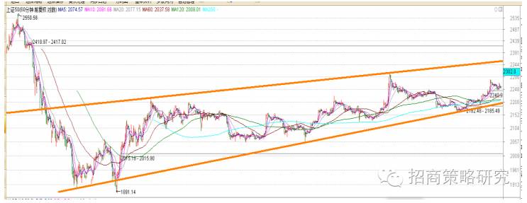 创业板指数的波段走势与上证50类似,但产生不同的图形。上证50走出3-3-5形态的楔形,。创业板指数则走出A-B-C-D-Ea-Eb-Ec-Ed-Ee的9浪结构,且目前处于Ed的调整中,并随着上攻形成Ee的最后一个波段上涨。创业板指数的转机在于下次上攻时,用带量的大阳线攻破上轨2270附近的阻力,否则将进一步缩量,回落将不可避免。