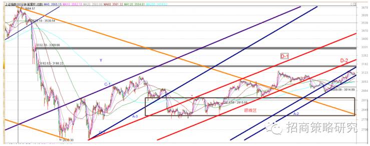从原则上看,作为市场风向标和引导器的上证50指数在今天受挫,最近几天的调整仍然不能确定结束,特别是时间周期上仍然太短促。调整结束后,,创出新高的可能性。届时可能发生各个权重板块的大合唱行情。从元月份到现在,指数上攻走出3-3-5波段,且5波构成的C已经走完了4个波段,每波为3小浪形态,一个总体性的调整很有可能在指数再一次冲击上轨后展开。根据这种悲观的估计,作为市场核心的上证50指数处于A-B-C-X-A-B-C中3-3-5结构的第二个B的,B-5-2调整中,随后的3浪上攻就将结束8个月以来的反弹。