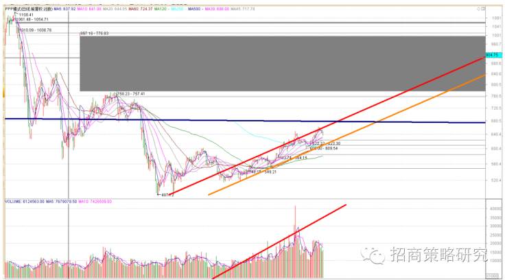 目前市场最为强势的和有引导性的板块仍然是PPP模式,目前仍然在上涨通道中运行,不利之处是最近两个高点的量能出现背离,核心个股,如东方园林已经回调比较深。可能也将面临对5月份以来全部涨幅的回调。但是,该指数目前的5浪结构清晰,没有明显的缺陷,可能是某个级别的一浪上攻,回调后的3浪值得期待。
